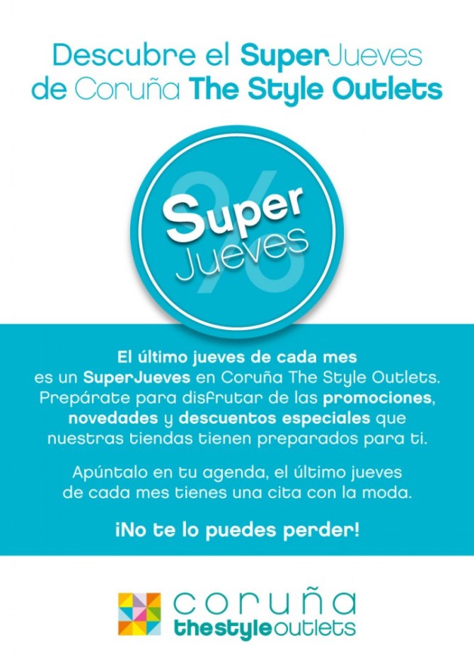 Está claro, hoy es jueves 24, o mejor dicho, superjueves en The Style Outlets Coruña. Llega el último jueves del mes, y como ocurrió en octubre, tenemos un día cargado de promociones, descuentos especiales y ofertas en las tiendas que integran el centro comercial. Si sigues su twitter, puedes ver como cada tienda tiene una promoción específica y entre todos, configuran un día de shopping verdaderamente intenso. Tampoco pierdas de vista su blog y entérate de todo lo que ocurre diariamente. Caza las ofertas y disfruta del sol!