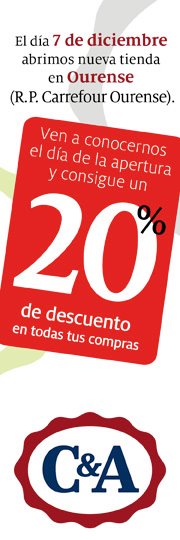 Todo llega y C&A abre hoy en Ourense su primera tienda. Desde que a mediados de los 80 la multinacional con origen holandés abriera en A Coruña y Vigo, ninguna otra ciudad gallega había contado con una de sus tiendas. Ahora, casi 25 años más tarde llega la siguiente apertura, al márgen de las 4 que hay en A Coruña o las 2 de Vigo, a las proximidades de Carrefour en A Valenzá. La tercera ciudad gallega cuenta desde hoy -con descuentos de un 20% por la inauguración- con 1.200 metros cuadrados de supeficie de venta y el aspecto más actual de las tiendas de la cadena. Abre al lado de Sprinter -también funciona desde hace un par de meses-, y lo hace con la mirada puesta en la siguiente apertura. Será el 9 de febrero y llevará C&A a Lugo. Estará en el centro comercial As Termas. Seguiremos Informando.